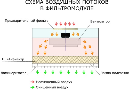 - При помощи ламинаризатора выходящий из фильтромодуля поток очищенного воздуха равномерно распределяется по всей площади под фильтромодулем и становится однонаправленным (ламинарным).