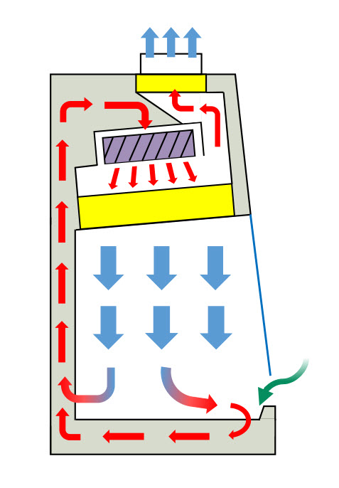 Защита оператора обеспечивается входящим через оконный проем воздушным потоком, который создает ограждающую оператора воздушную завесу. Часть входящего через оконный проем воздуха, проходя сквозь перфорацию в передней части столешницы, подается на рециркуляцию, остальная часть воздуха эффективно фильтруется HEPA-фильтром и выбрасывается в окружающую среду или в систему вытяжной вентиляции.